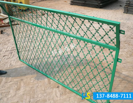 交叉型刀片刺網(wǎng):螺旋型交叉式刀片刺網(wǎng)系在兩條刀片刺網(wǎng)之間以不銹鋼片和鍍鋅鋼片強(qiáng)力夾扣,展開后即呈交叉狀,使其美觀又實用。