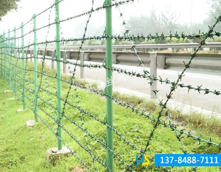 刺絲刺繩護(hù)欄網(wǎng)網(wǎng)也稱為刀片刺絲護(hù)欄網(wǎng)、刀片刺網(wǎng)護(hù)欄網(wǎng),是一種新型護(hù)欄網(wǎng)產(chǎn)品。是在兩條刀片刺網(wǎng)之間以不銹鋼片和鍍鋅鋼片強(qiáng)力夾扣,展開后即呈交叉狀。它具有嚇阻效果好、美觀、施工便利,經(jīng)濟(jì)實用等優(yōu)異特點。主要用于園林公寓,機(jī)關(guān)單位,監(jiān)獄,哨所,邊防等的圈禁防護(hù)。刀片刺網(wǎng)是由熱鍍鋅鋼板或不銹鋼薄板沖壓處尖銳的刀片狀,高張力鍍鋅鋼絲或者不銹鋼絲做芯線組合而成的阻絕器材。由于刺網(wǎng)造形獨(dú)特不易觸摸,因而能達(dá)到極好的防護(hù)隔離效果。