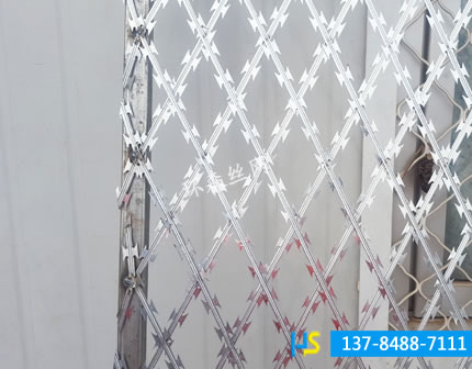 交叉型刀片刺網(wǎng):螺旋型交叉式刀片刺網(wǎng)系在兩條刀片刺網(wǎng)之間以不銹鋼片和鍍鋅鋼片強(qiáng)力夾扣,展開后即呈交叉狀,使其美觀又實用。